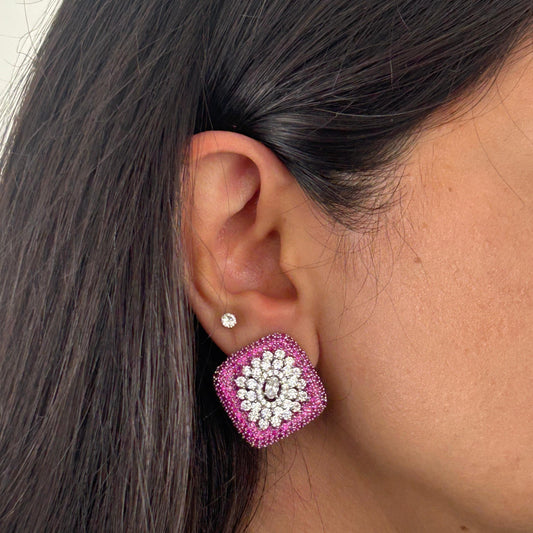 Square Floral Diamond Studs with Pink Zircons