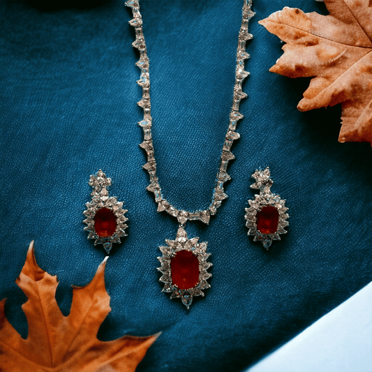 • Silver Finished Diamond and Ruby Necklace with Earrings - Juwelen