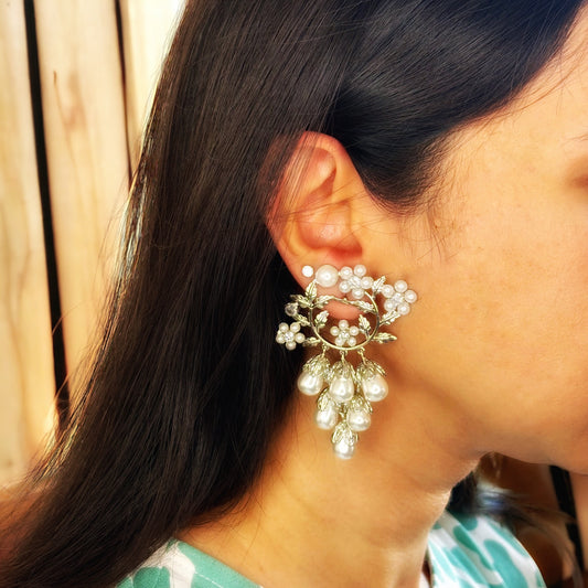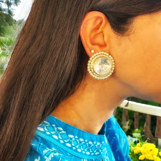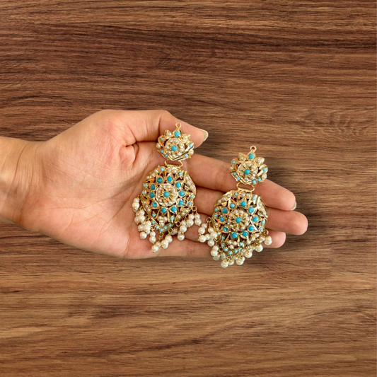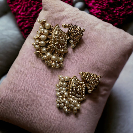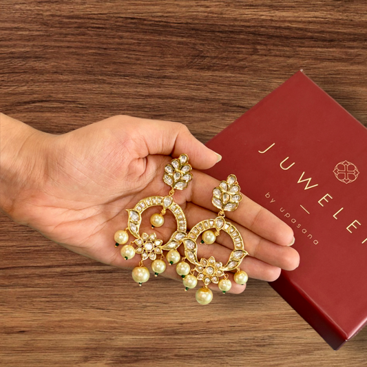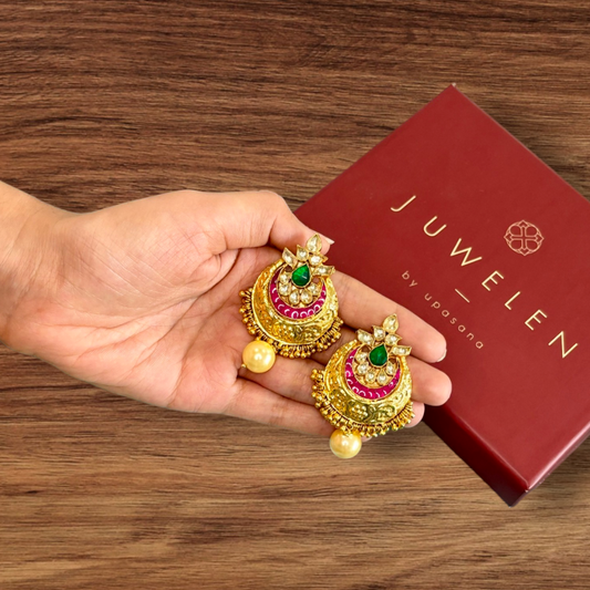 Gold Finished Kundan Earrings with green and pink detailing with pearl drops